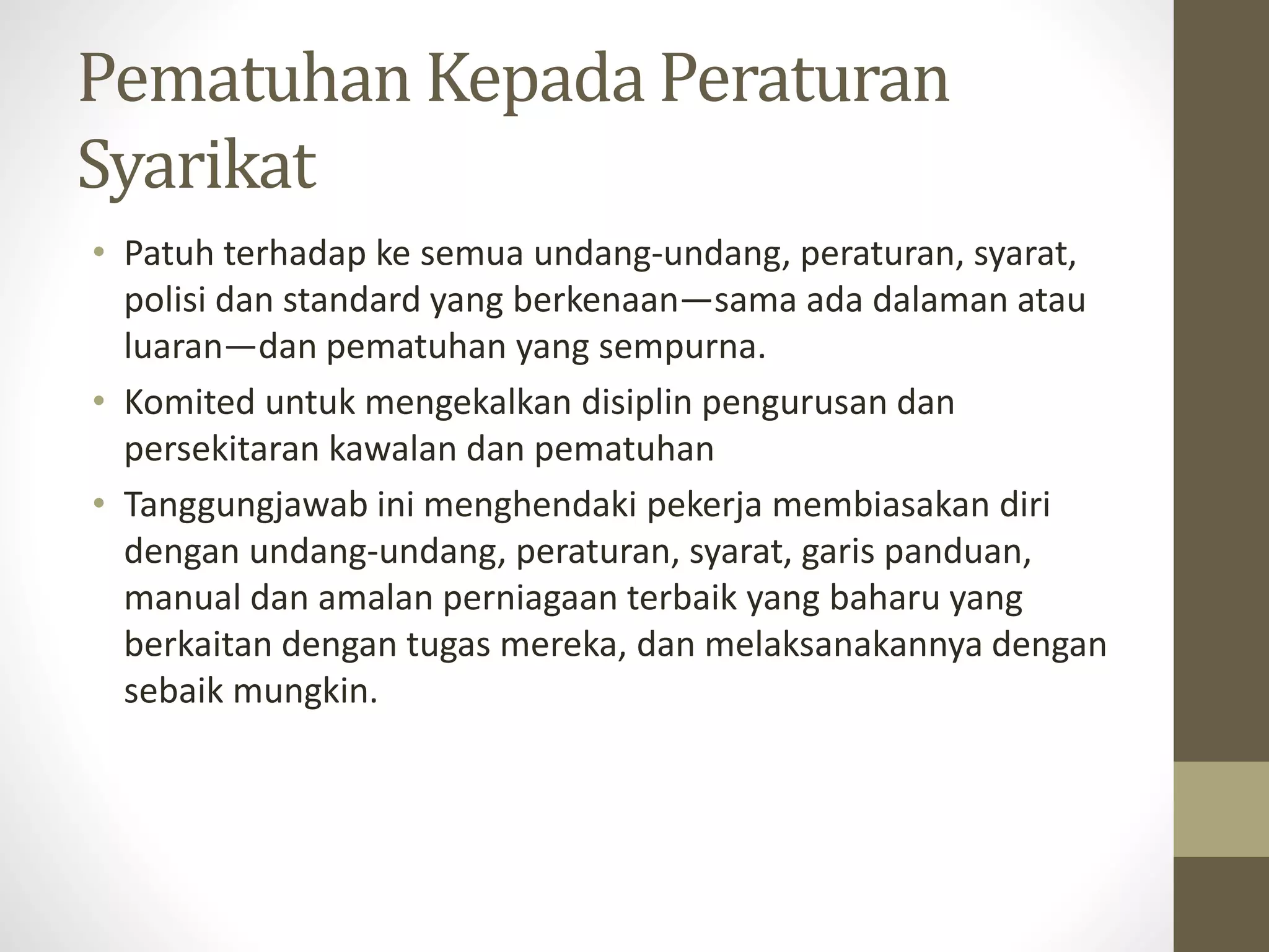 Peraturan 3 Peraturan-Peraturan Tatatertib Badan-Badan Berkanun Akta Badan-Badan Berkanun Tatatertib dan Surcaj 2000 Akta 605-1. Syarikat dengan ini menasihatkan anda supaya mematuhi. 21 Peraturan ini hendaklah terpakai bagi semua kakitangan kecuali semua Pengarah UrusanSyarikat.
